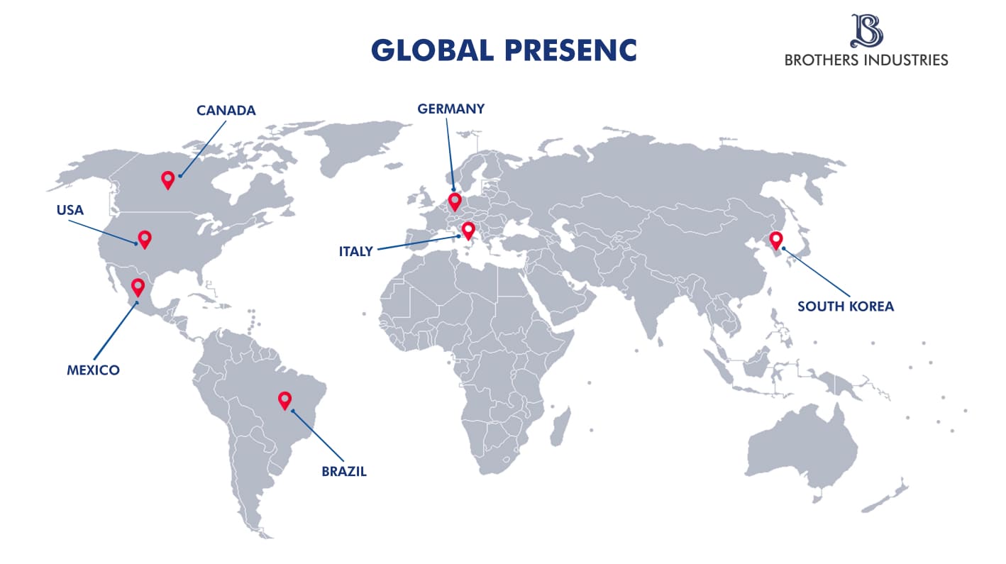 Brother Industries has established a strong global presence, delivering excellence in every corner of the world." With offices and manufacturing facilities strategically located worldwide, Brother Industries ensures a seamless and efficient experience for our global clientele. With a commitment to serving diverse markets across continents, Brother Industries proudly extends its reach to provide unrivaled products and services on a global scale.